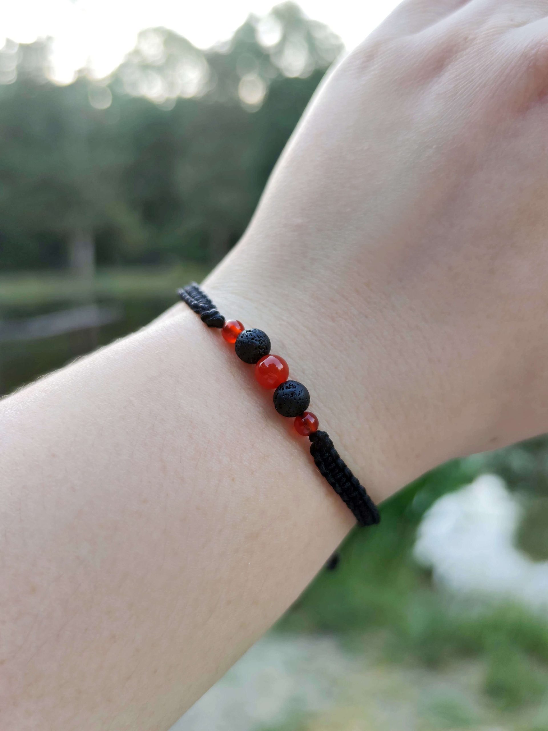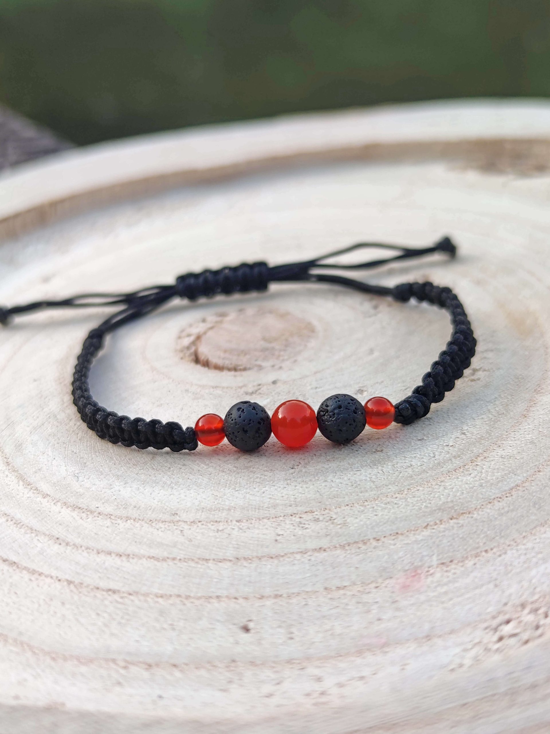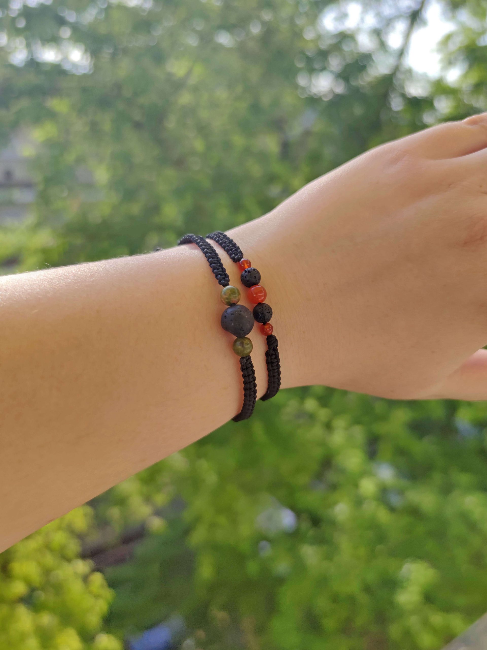 A csomag tartalma 1 darab Lávakő és Unakit aromaterápiás karkötő és 1 darab Karneol és Lávakő aromaterápiás karkötő.