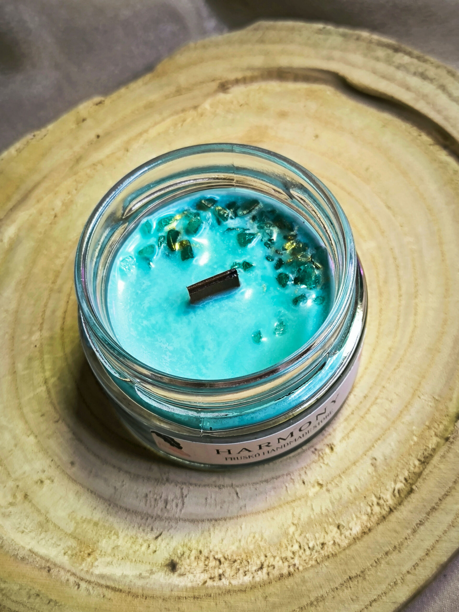 A gyertya tetején található aventurin ásványchips. Az aventurin ásványt az egyik legjobb stresszoldó kőnek tartják. Segít enyhíteni a feszültséget és a szorongást, és javítja az általános mentális egészséget. Támogatja a pozitív gondolkodást és a kreativitást, valamint segíthet a döntéshozatalban. Ezenkívül néhány ember szerint jótékony hatással van a szív- és érrendszerre, valamint a gyulladásokra. Azt is mondják, hogy segít megtalálni és megtartani a szerelmet, és javítja az általános érzelmi egyensúlyt.