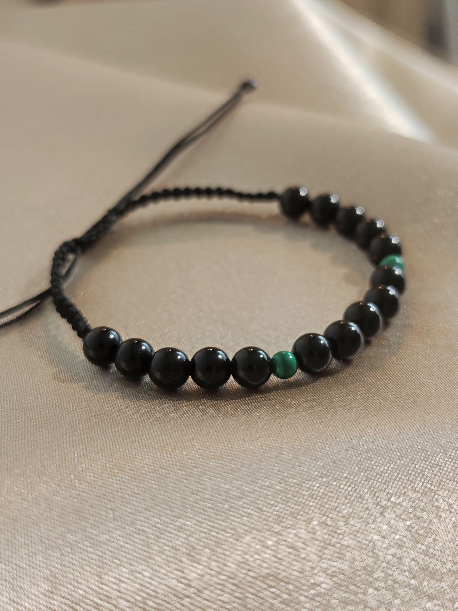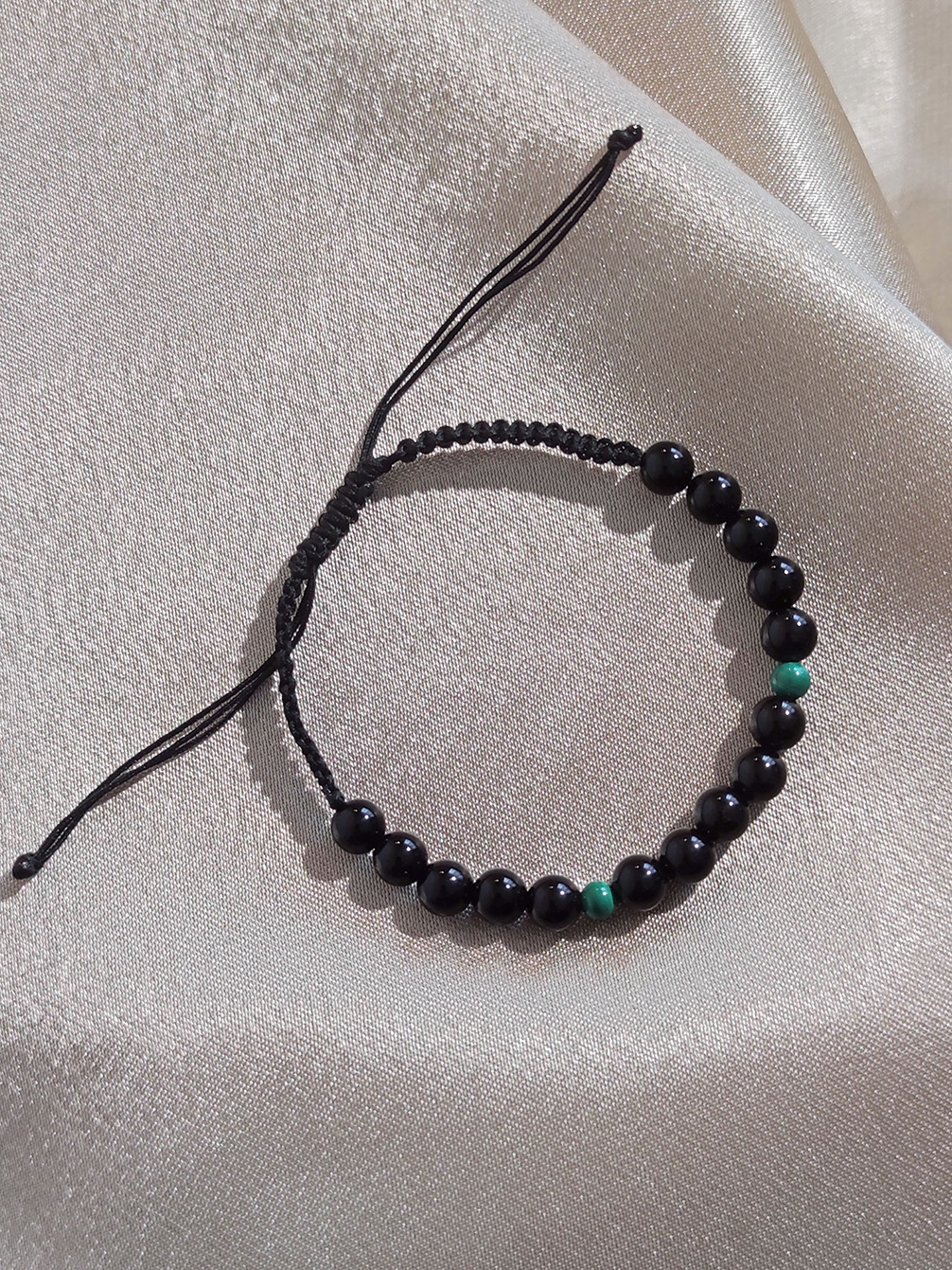 Az ónix rengeteg pozitív hatással rendelkezik, amelyek közé tartozik, hogy erős védő hatással rendelkezik, amely segít elhárítani a negatív energiákat és elriasztani a rosszindulatú gondolatokat. Segít a földelésben és az energetikai egyensúly megteremtésében is. A malachit erős gyógyító energiával rendelkezik, amely segít a test és az elme harmonizálásában. Serkenti az immunrendszert és segít a fizikai gyógyulásban, emellett segíti a fájdalom enyhítését és a sebek gyógyulását. Eltávolítja a negatív energiákat és elriasztja a káros sugárzásokat, segít az auratér tisztításában és védelmében. A karkötő csúszócsomós megoldással készül, így bármekkora csuklóméretre megfelelő lehet.
