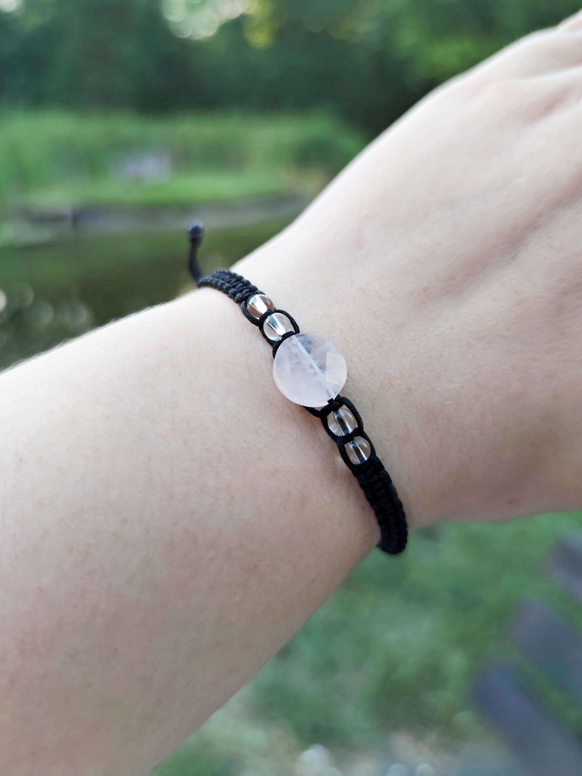 A Rózsakvarc a feltétel nélküli szeretet és a végtelen béke ásványa, tökéletes szerelemvonzáshoz, a Hegyikristály pedig segít kiegyensúlyozottá válni testileg és lelkileg, emellett pedig a többi kő hatását is felerősíti. A csúszócsomós megoldásnak köszönhetően állítható méretű, így bármekkora csuklóméretre tökéletes megoldás.